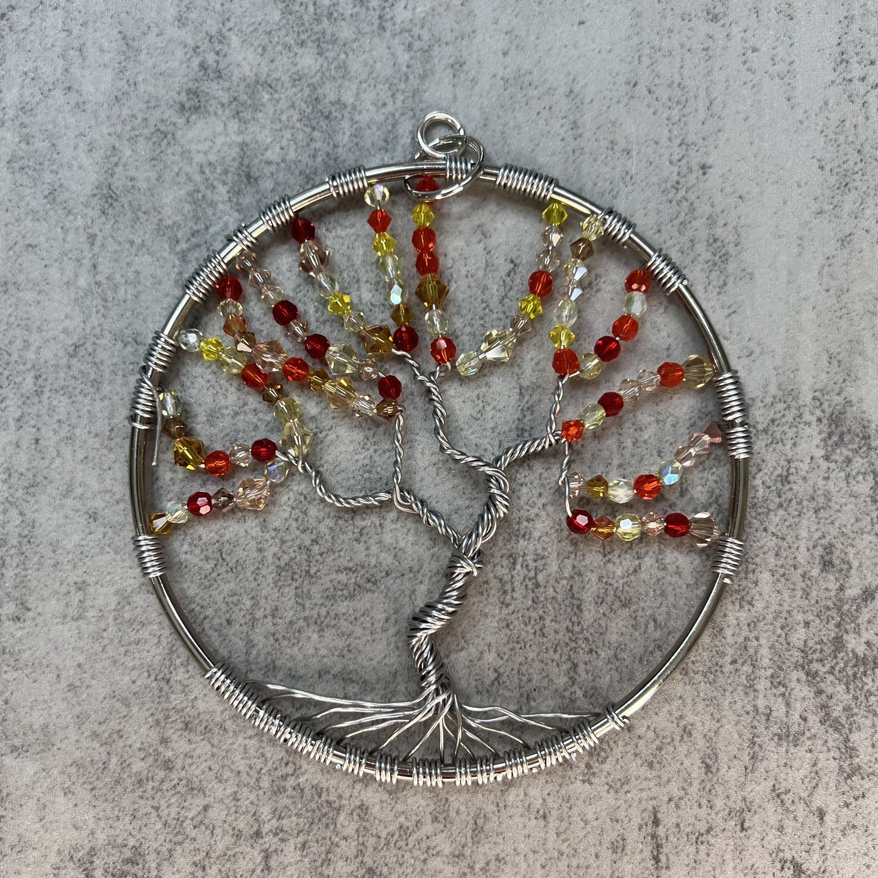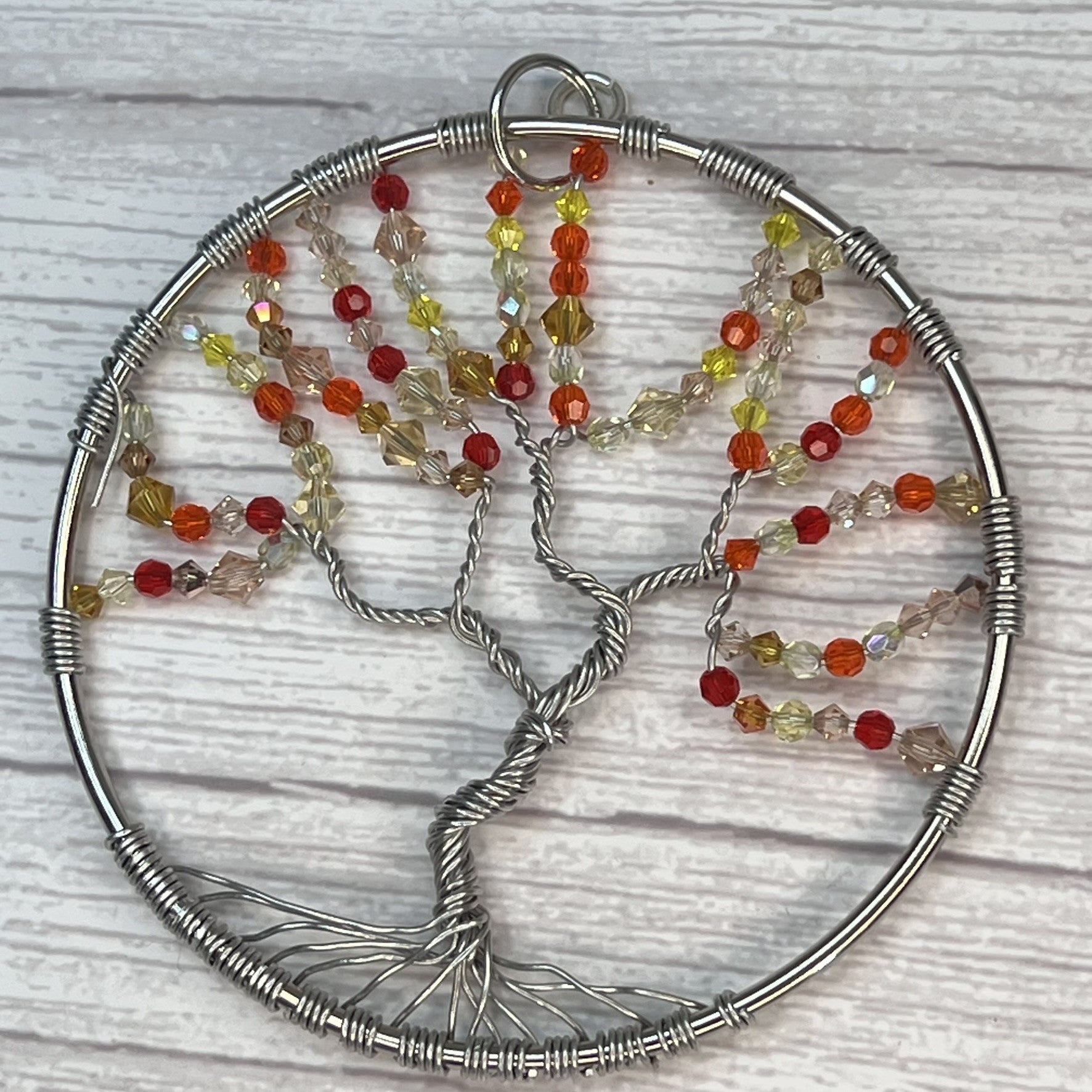 Celebrate the fiery beauty of autumn with this Tree-of-Life suncatcher, sparkling in reds, oranges, yellows, and clear Czech crystals. Each facet catches the light like a crisp fall leaf, while the playful design adds a wink of whimsy to your window. Bold, warm, and full of seasonal charm-aren't you glad it's autumn all year long?